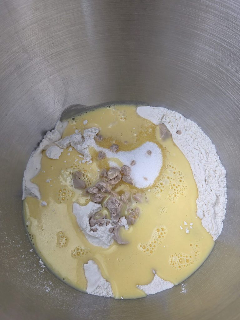 In der Schüssel der Küchenmaschine das Mehl, den Zucker, die zerbröckelte Hefe und die Hälfte der Milch-Eier-Mischung sammeln. Die Küchenmaschine (mit montiertem Spiralhaken) starten und mit dem Kneten beginnen, während die restliche Milch-Eier-Mischung nach und nach hinzugefügt wird.