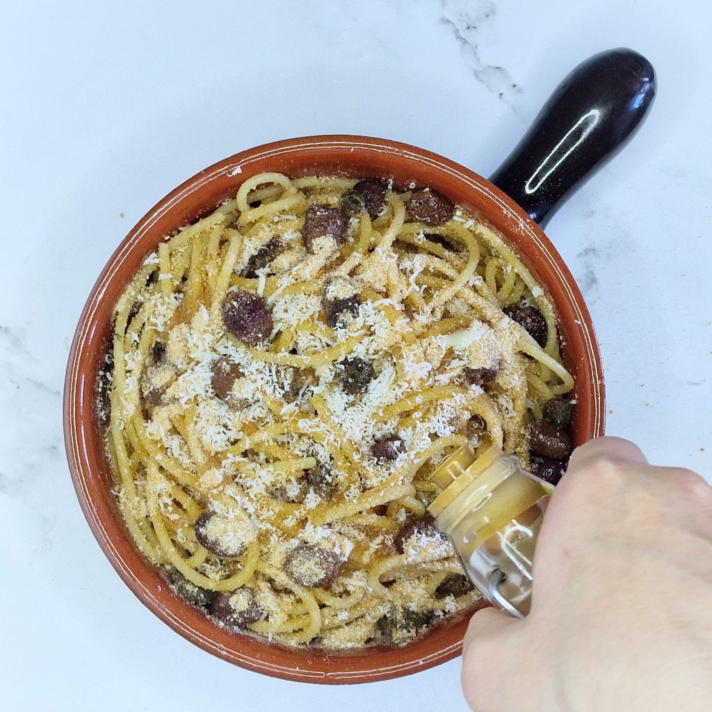 Ein sehr einfach zuzubereitender erster Gang mit nur wenigen Zutaten, der jedoch dem gesamten Gericht viel Geschmack verleiht: Knoblauch, Öl, Oliven, Kappern, Semmelbrösel und eine Prise geriebener Pecorino.