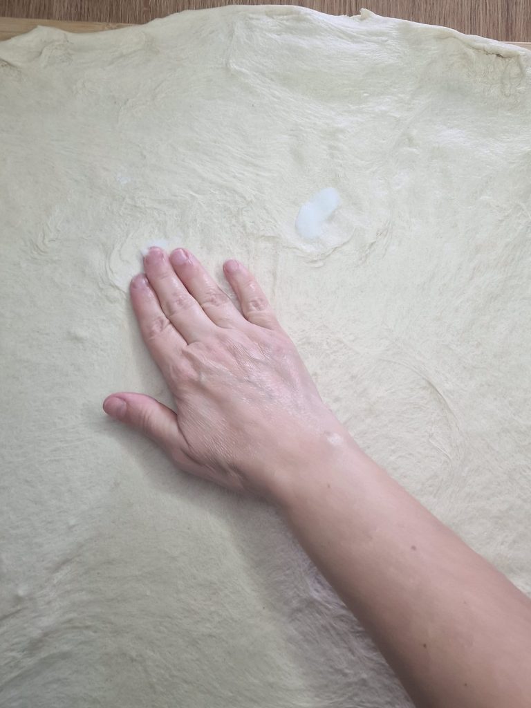 Fetten Sie zu diesem Zeitpunkt das Teigbrett mit Schmalz ein und rollen Sie den inzwischen gegangenen Teig aus.