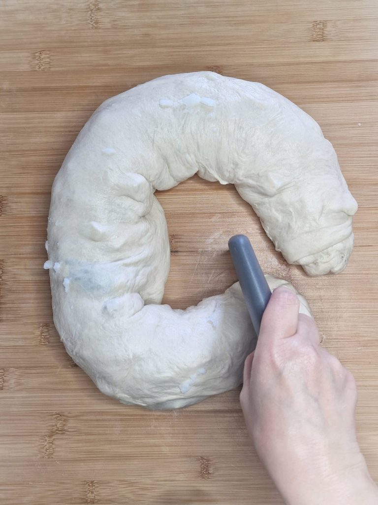 Sobald der gesamte Teig aufgerollt ist, entfernen Sie die beiden Enden der Rolle (die normalerweise wenig Füllung haben) und formen Sie den Tortano, indem Sie ein Ende in das andere einsetzen.