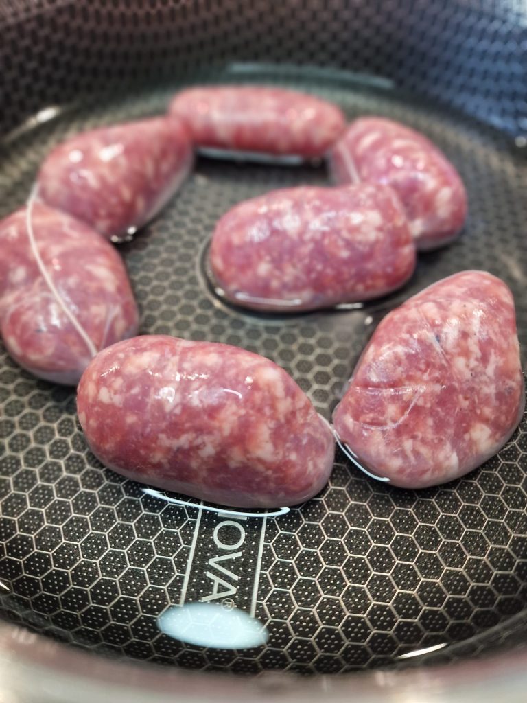 Legen Sie die Würste in eine Pfanne mit etwas Wasser und lassen Sie sie bei schwacher Hitze garen, indem Sie sie gelegentlich wenden. Wenn das Wasser verdampft ist, fügen Sie einen Spritzer Öl hinzu und braten Sie sie ein paar Minuten an.