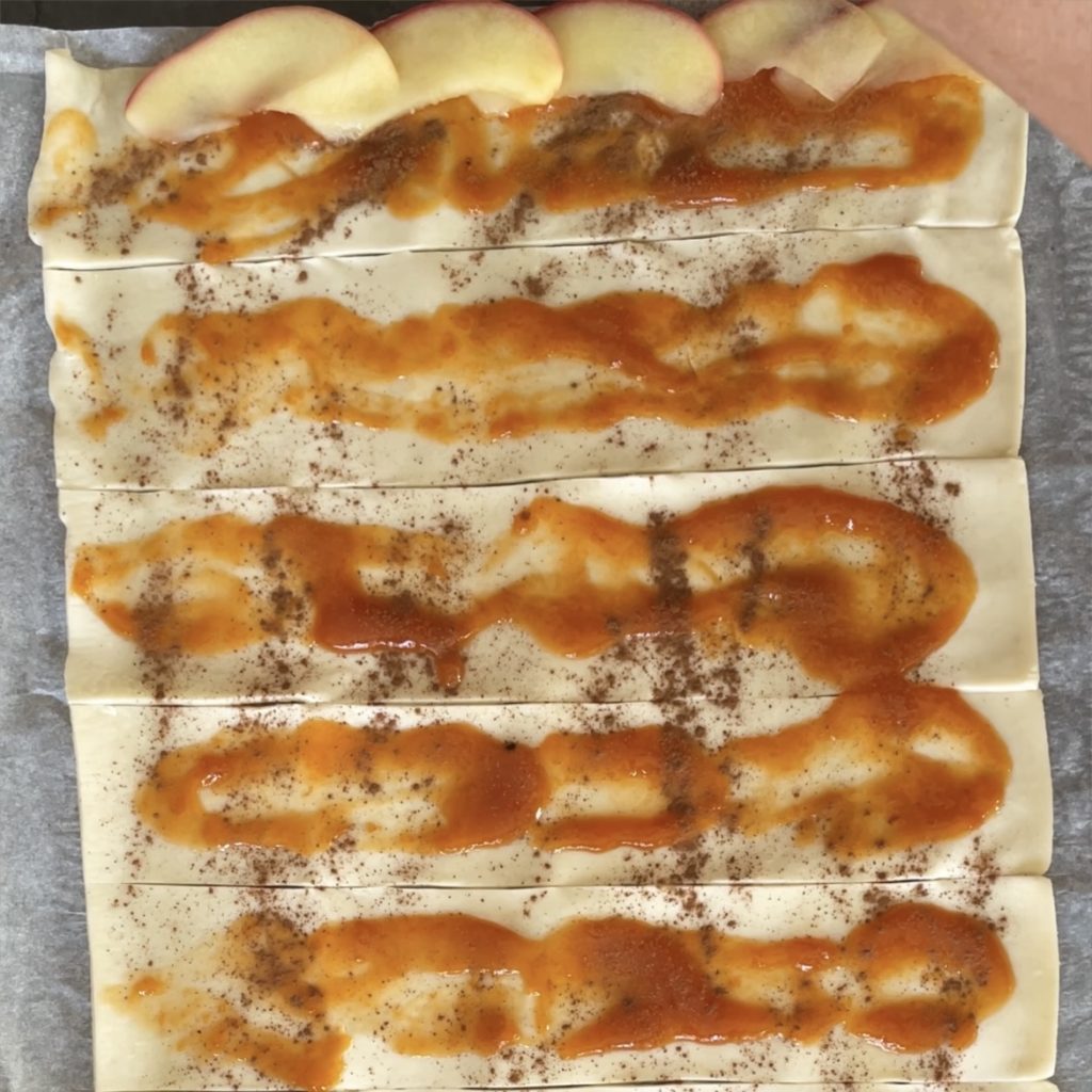 Rollen Sie den Blätterteig aus, schneiden Sie ihn in 6 Streifen von etwa 5-6 cm Höhe, streichen Sie einen Löffel Marmelade auf jeden Streifen,