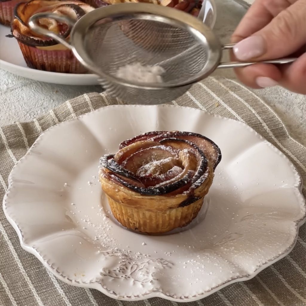 Apfelrosen aus Blätterteig ein Dessert mit Blätterteig, das vor einigen Jahren im Internet populär wurde, ist mittlerweile ein Rezept, das wir alle mindestens einmal machen müssen. Die Blätterteig-Apfelrosen sind einfach zu machen, lecker und vor allem sehr schön anzusehen, hervorragend als Dessert nach dem Essen, für den Nachmittagskaffee oder zum Frühstück. Wenn Sie Ihren Gästen die Blätterteig-Apfelrosen servieren, werden sie von der Schönheit dieses kleinen Desserts beeindruckt sein. Es braucht nur wenige Schritte, um sie einfach und schnell zu machen. Wenn Sie diese Art von Dessert mögen, probieren Sie auch die APFELTORTE MIT BLÄTTERTEIG wie eine Rose. Diese wird im Gegensatz zu den einzelnen Apfelrosen in Scheiben geschnitten. Ich empfehle Ihnen auch die salzige Version der BLÄTTERTEIG- UND KARTOFFELROSEN für eine raffinierte und köstliche Vorspeise. Jetzt sehen wir uns an, wie man die Blätterteig-Apfelrosen macht, und wenn Sie sie ausprobieren, lassen Sie es mich wissen. Barbara