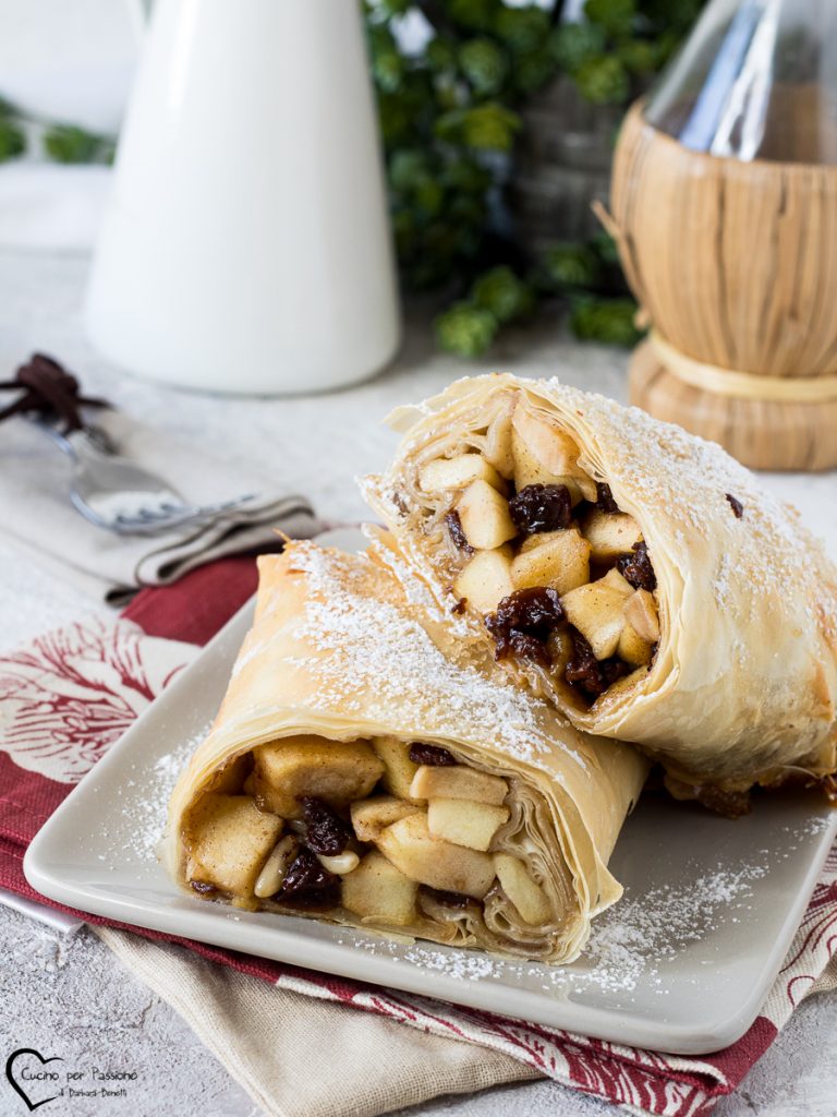 • Backe den Strudel im vorgeheizten Backofen bei 180 °C (Ober-/Unterhitze) für 40 Minuten. Der Filoteig sollte goldbraun und knusprig werden. Wenn er fertig ist, nimm ihn aus dem Ofen und bestäube ihn mit Puderzucker.