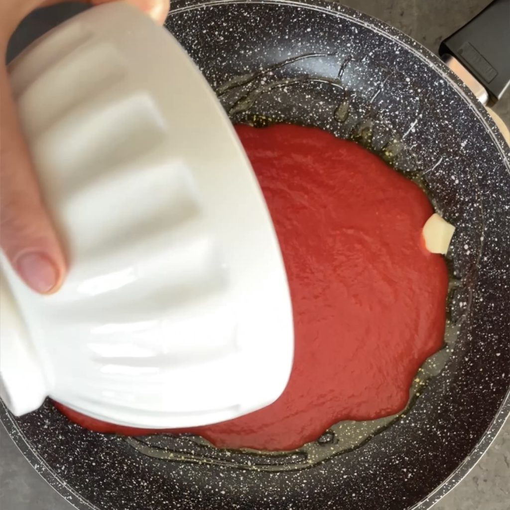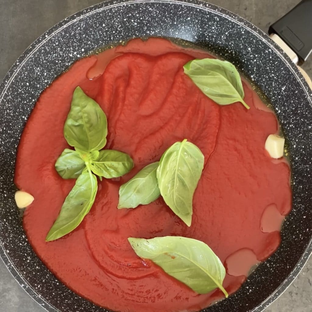 Gießen Sie Tomatenpassata darüber und verteilen Sie sie auf den Auberginen.