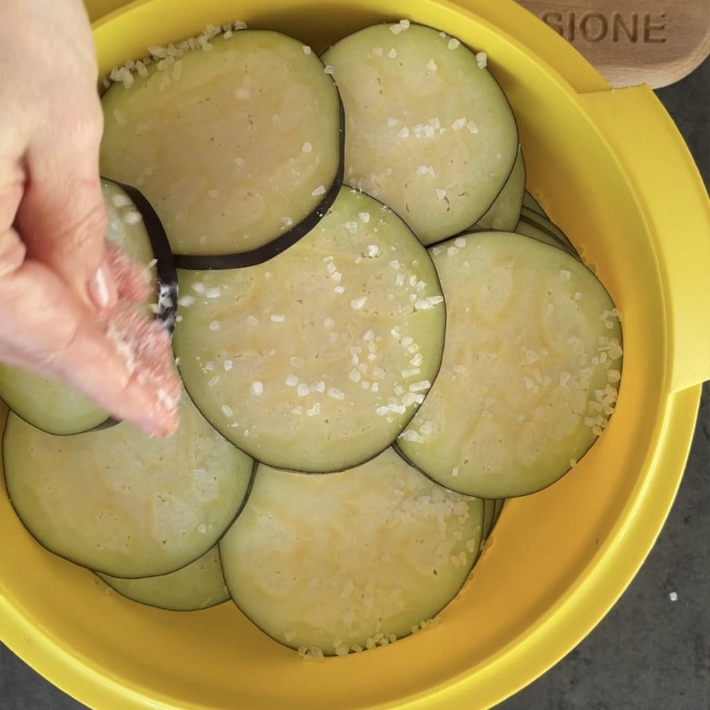 Lassen Sie sie mindestens eine halbe Stunde in einem Sieb ruhen, indem Sie sie schichtweise mit grobem Salz bestreuen.
