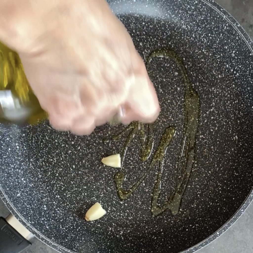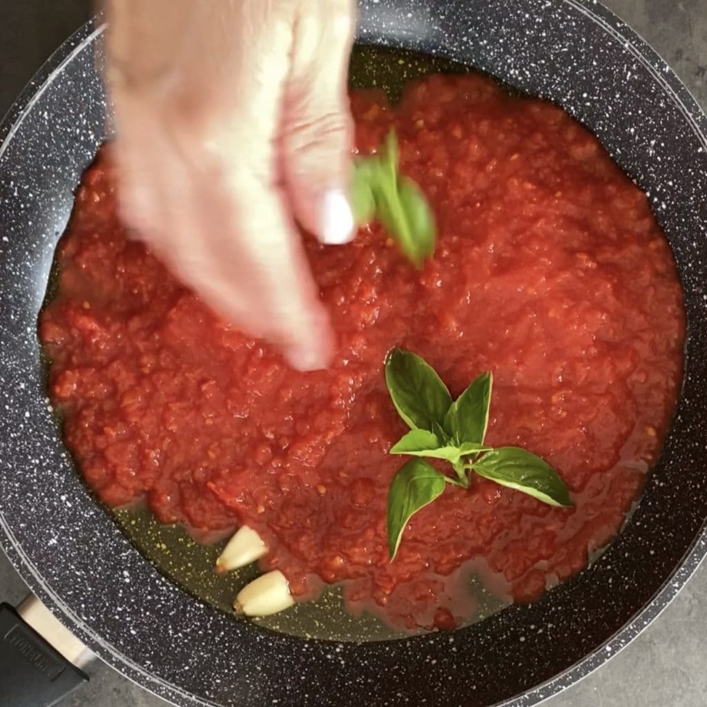 und Basilikumblätter, mit einem Deckel abdecken und 10/15 Minuten kochen lassen. Am Ende der Garzeit den Knoblauch entfernen.