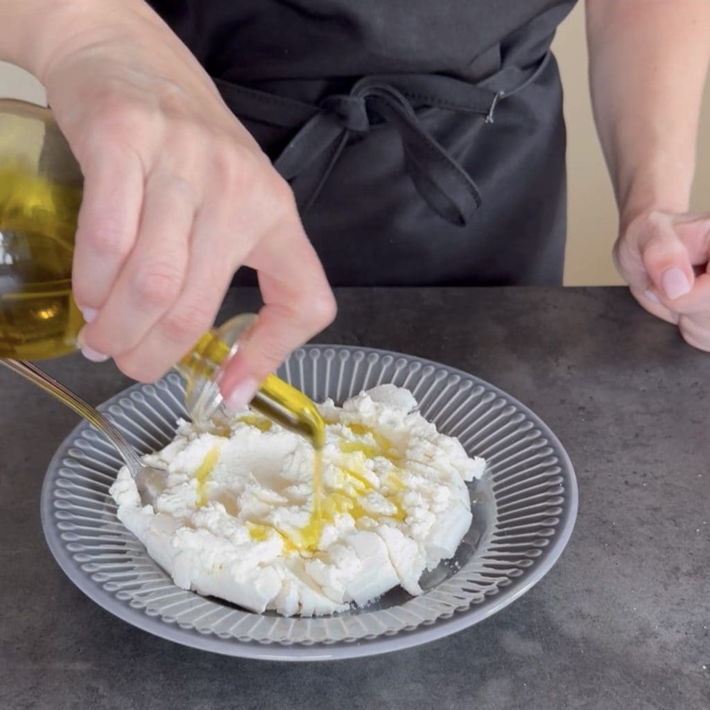 In der Zwischenzeit geben Sie die Ricotta in einen Teller und arbeiten sie zu einer Creme