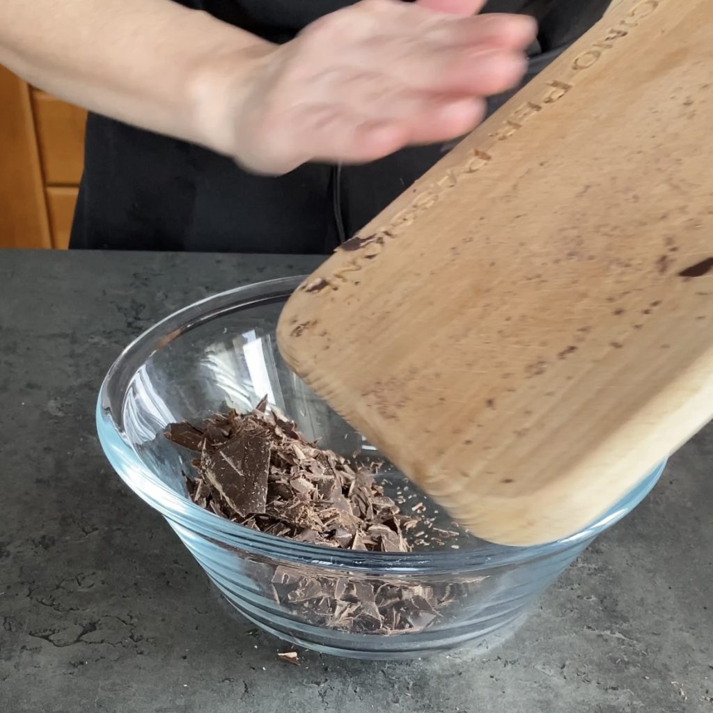 Beginnen wir mit der Zubereitung des Banane-Schokolade-Puddings, hacken Sie die Zartbitterschokolade mit einem Messer.