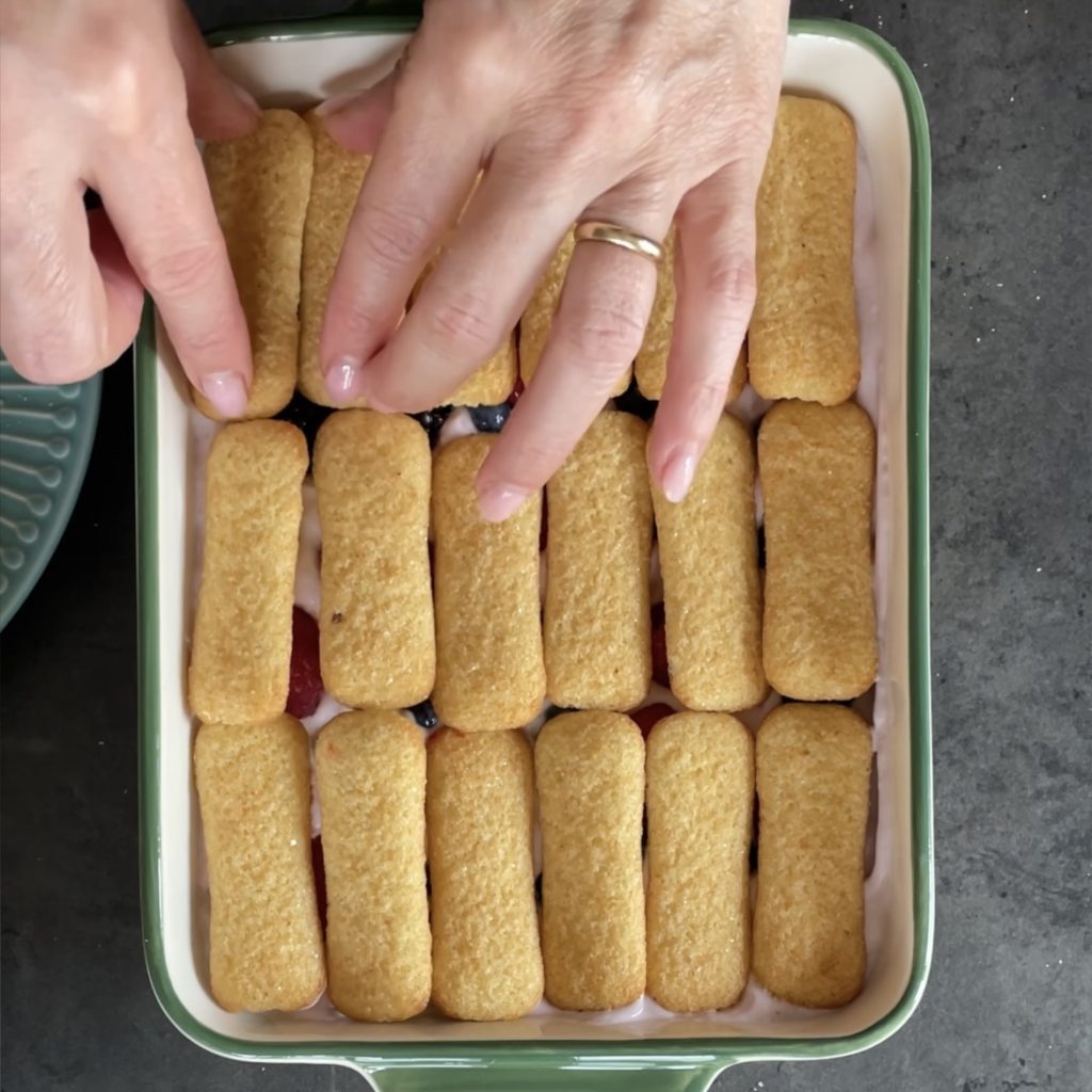 Decken Sie die Auflaufform mit Frischhaltefolie ab und lassen Sie den Beeren und Mascarpone Kuchen 6 Stunden im Kühlschrank ruhen, bevor Sie ihn servieren.