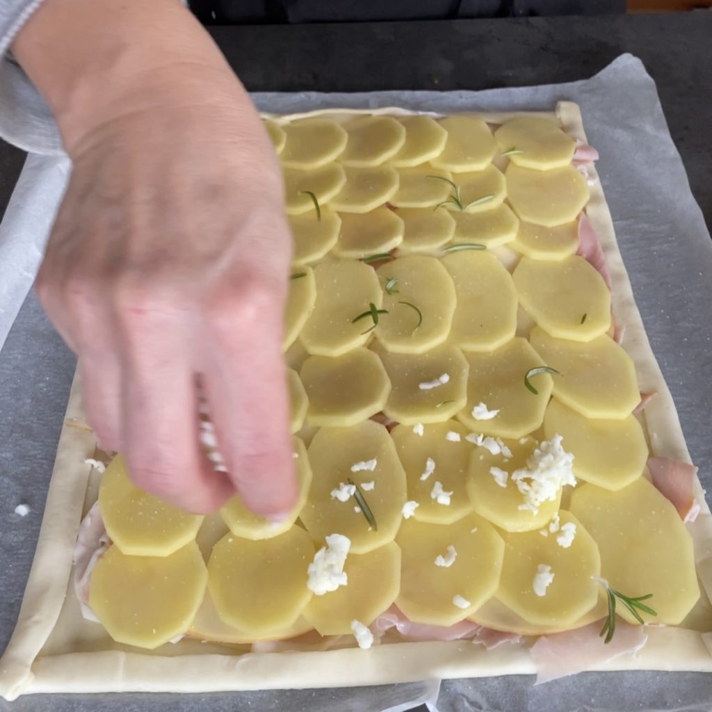 Schneiden Sie den Blätterteig mit Kartoffelscheiben und servieren Sie ihn.