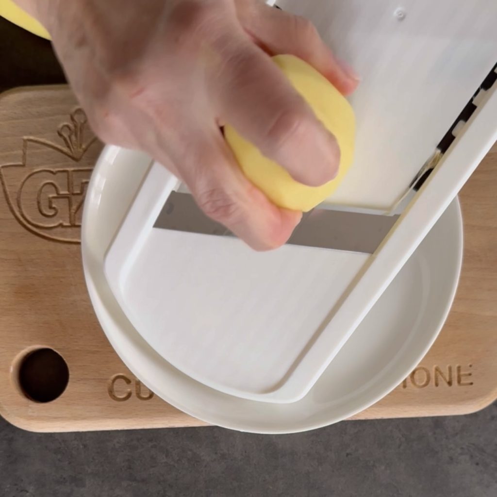 schneiden Sie sie mit einer Mandoline in Scheiben,