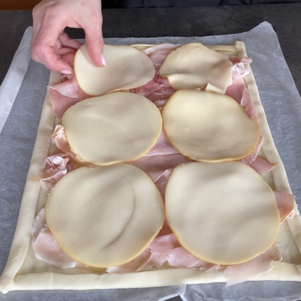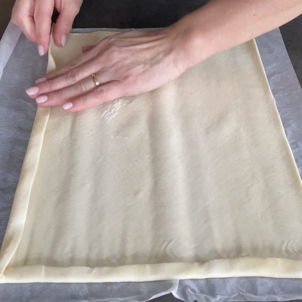 Rollen Sie den Blätterteig aus, falten Sie die Ränder, damit beim Backen ein Rand entsteht, und