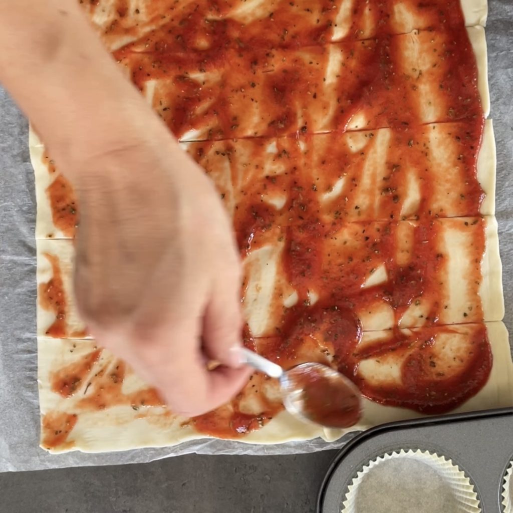 • Geben Sie die Tomatenpassata auf den Blätterteig,