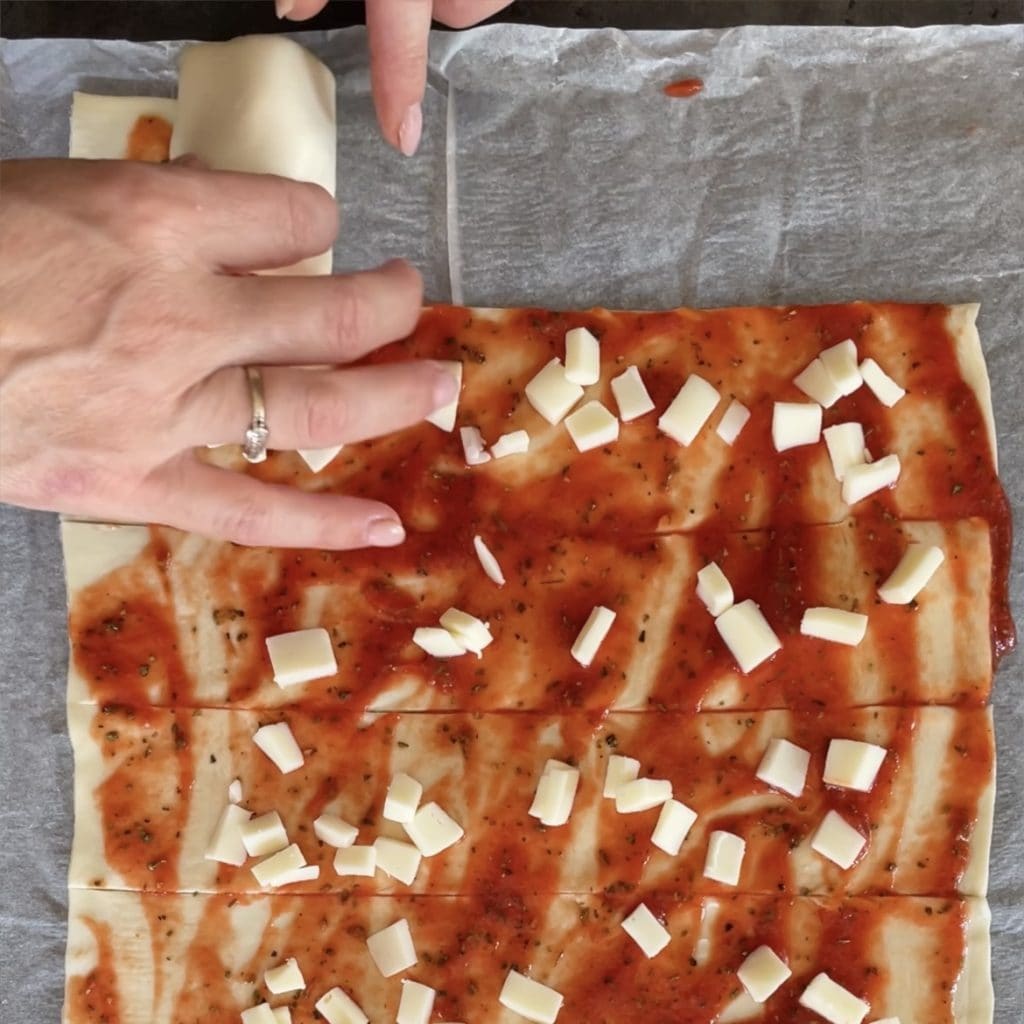 • Beginnen wir mit der Zubereitung der Blätterteig-Schnecken alla pizzaiola. Schneiden Sie die Pizzamozzarella in kleine Stücke.