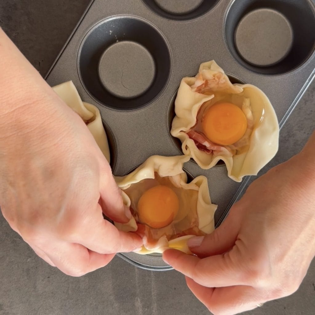 Blätterteigkörbchen gefüllt mit Eiern und Speck