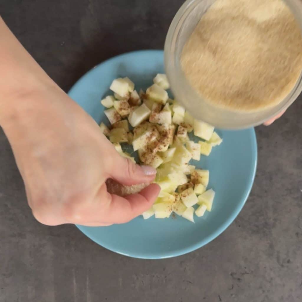 Geben Sie dann die Apfelstücke auf einen kleinen Teller, fügen Sie gemahlenen Zimt hinzu,