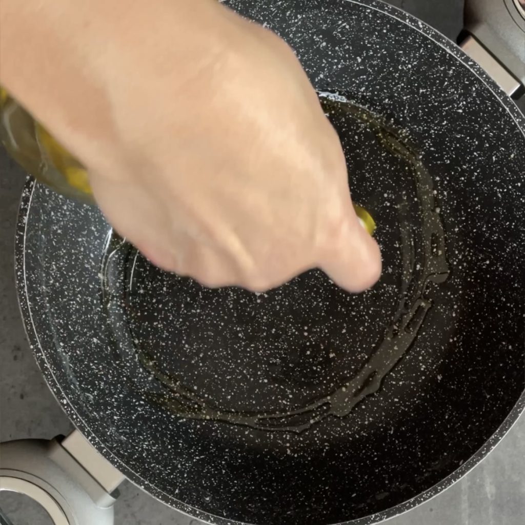 Geben Sie etwas natives Olivenöl in eine Pfanne, fügen Sie eine Knoblauchzehe hinzu.