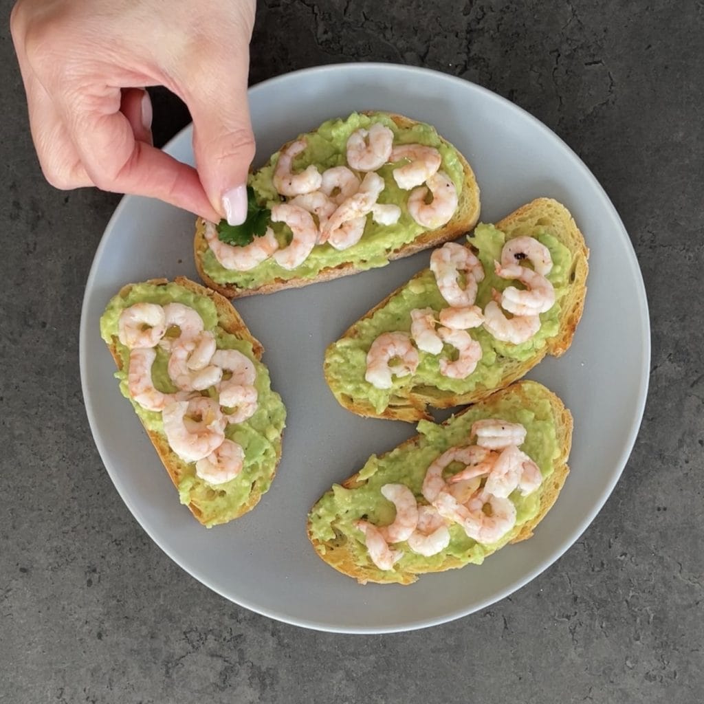 Platzieren Sie die Crostini mit Garnelen und Avocado-Creme auf einem Servierteller und bewahren Sie sie bis zum Servieren im Kühlschrank auf.
