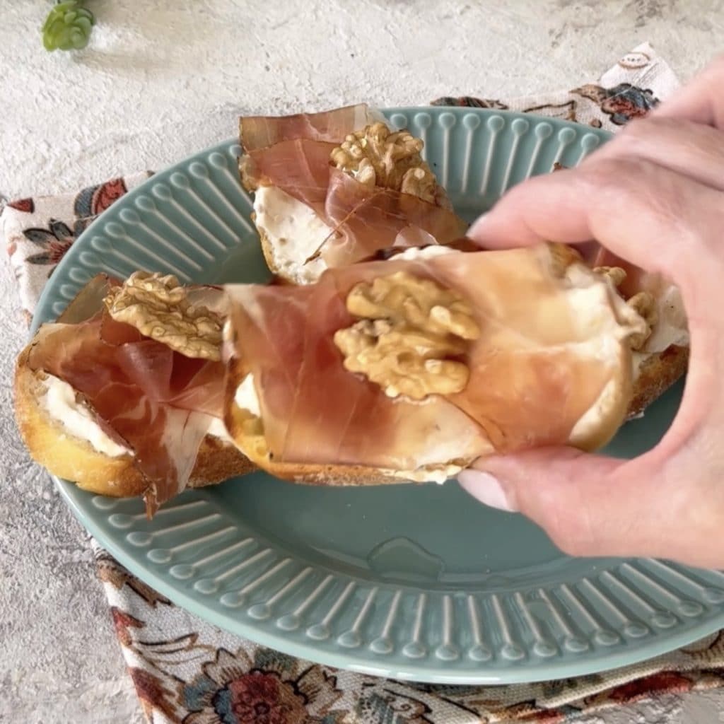 Servieren Sie die Crostini Philadelphia und Speck und Nüsse oder bewahren Sie sie im Kühlschrank auf, bis sie serviert werden.