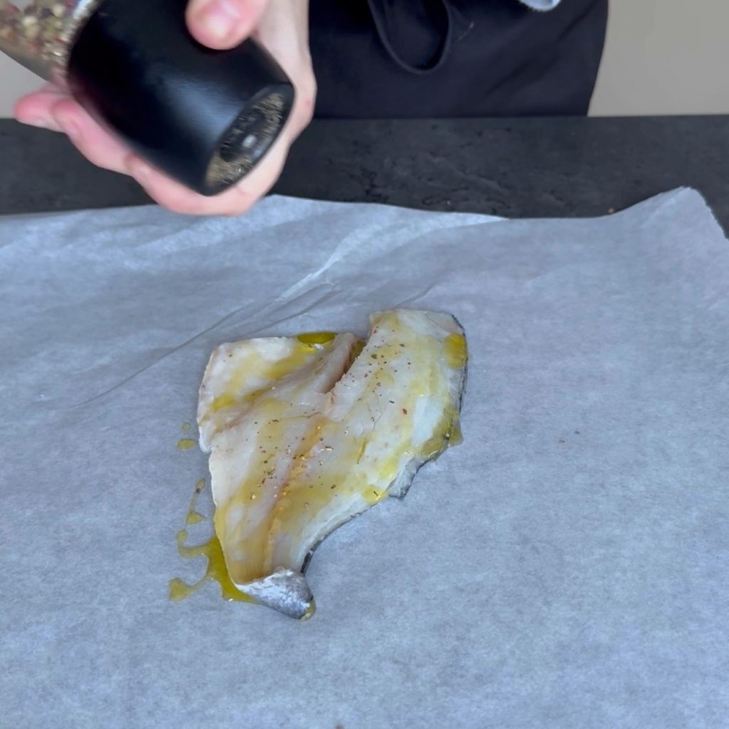 Legen Sie das Doradenfilet auf ein Blatt Backpapier, fügen Sie etwas natives Olivenöl extra hinzu