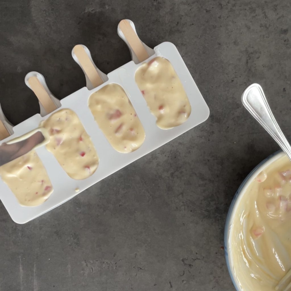 Setzen Sie das Holzstäbchen in die Eisform ein, geben Sie die Masse mit Hilfe eines Teelöffels in die Förmchen,