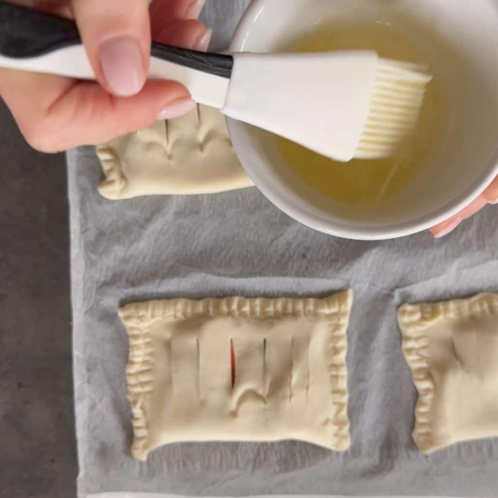 • Zu Beginn schneiden wir die Erdbeerblätterteigschnitten in dünne Scheiben,