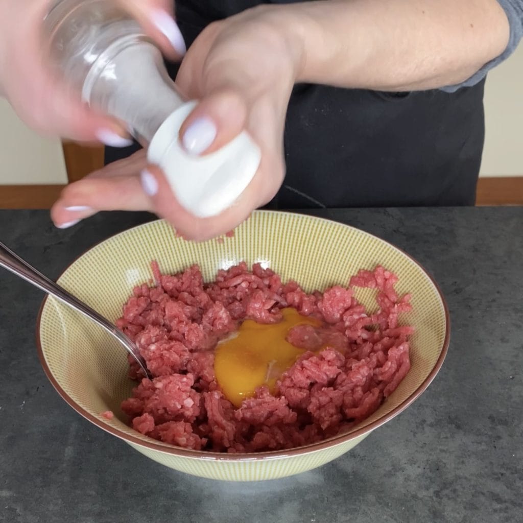 Nehmen Sie die Masse und formen Sie mit den Händen Frikadellen in der Größe einer Aprikose, drücken Sie sie gut fest und legen Sie sie dann auf einen Teller.