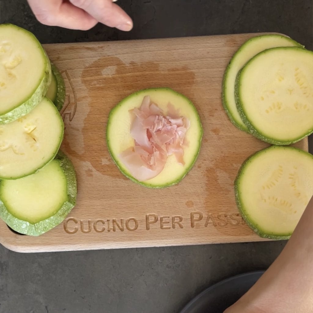 • Nehmen Sie nun eine Zucchinischeibe und legen Sie in die Mitte eine Scheibe gekochten Schinken.