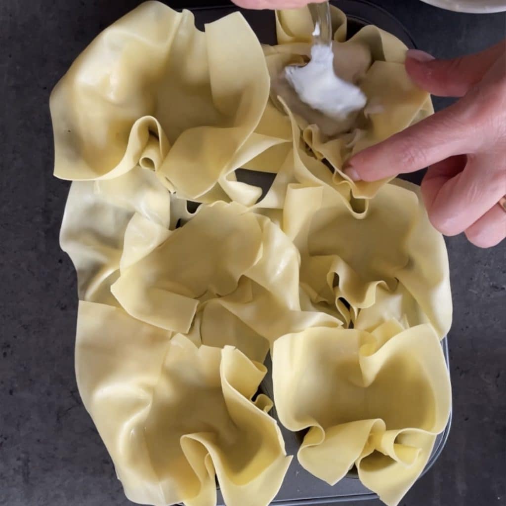 legen Sie jeweils zwei Nudelblätter übereinander in die Muffinform