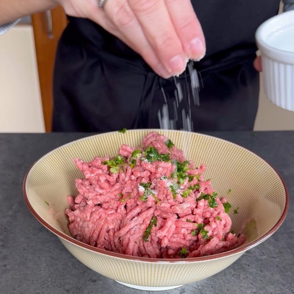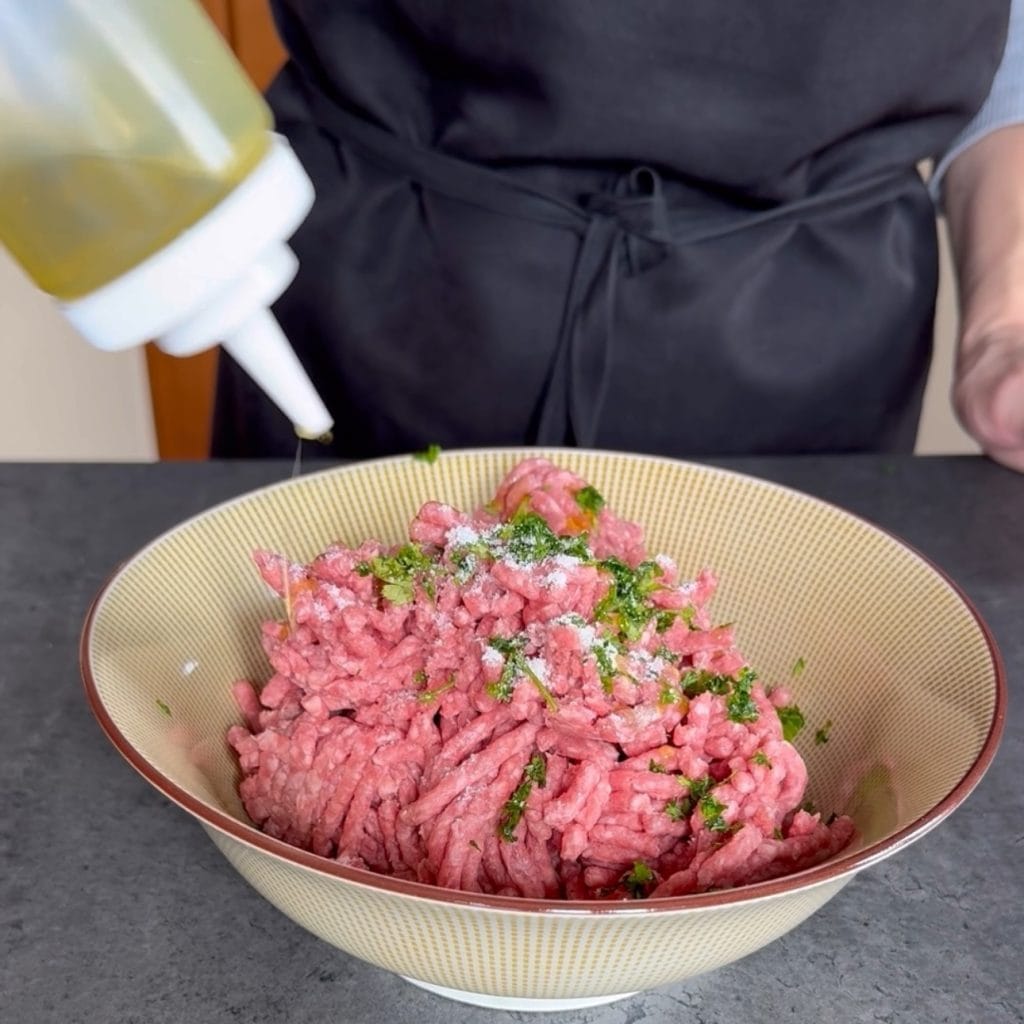 Beginnen wir mit der Zubereitung der gefüllten Hackfleisch-Rädchen mit Schinken. Geben Sie das Hackfleisch in eine Schüssel und fügen Sie gehackte Petersilie hinzu,