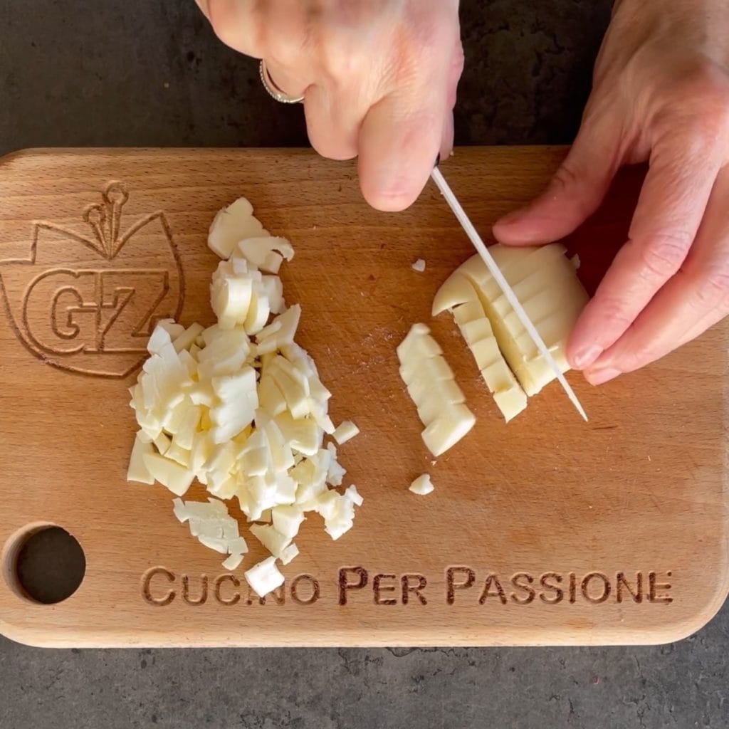 Schneiden Sie die Mozzarella für Pizza in Würfel.