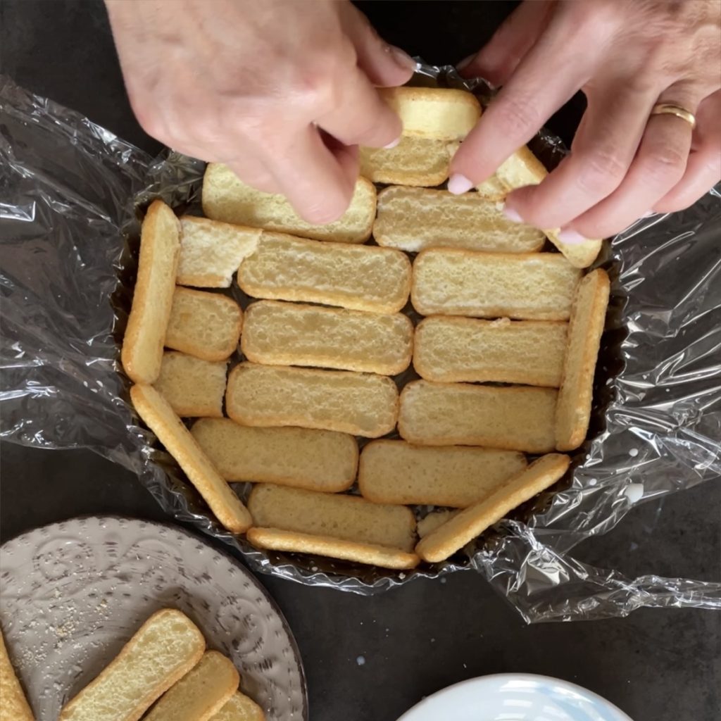 Bedecken Sie die Form mit Frischhaltefolie und lassen Sie sie großzügig überstehen, damit sie später umgeschlagen werden kann, um sie zu verschließen. Tauchen Sie die Pavesini in kalte Milch