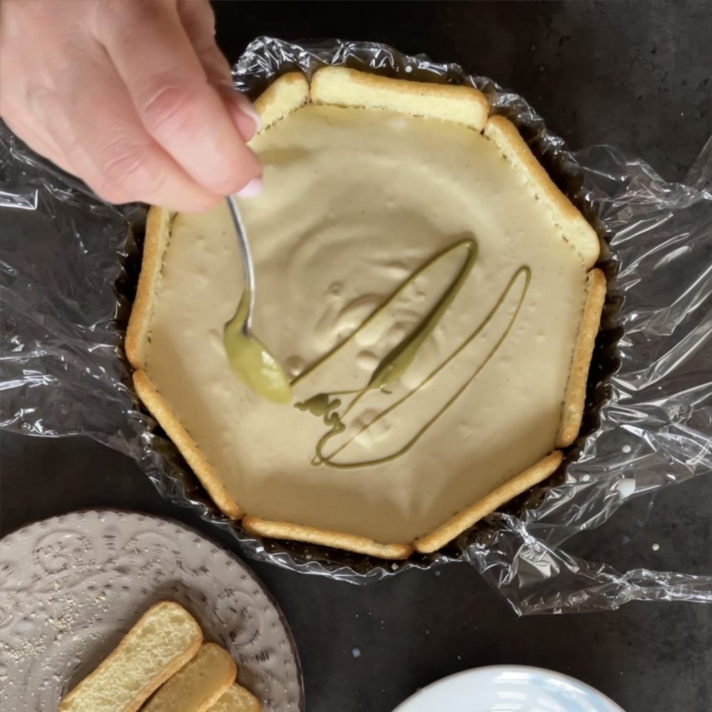 Bevor Sie ihn servieren, geben Sie auf die Oberfläche streichfähige Pistaziencreme und Pistazienkrokant,
