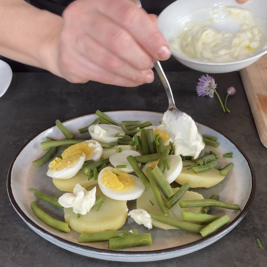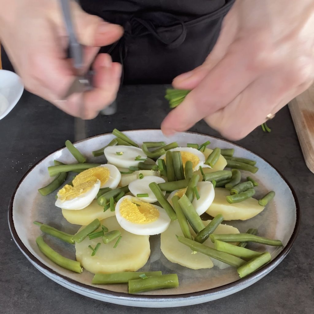 Zutaten für die Zubereitung des Grüne-Bohnen-Salats und Kartoffeln