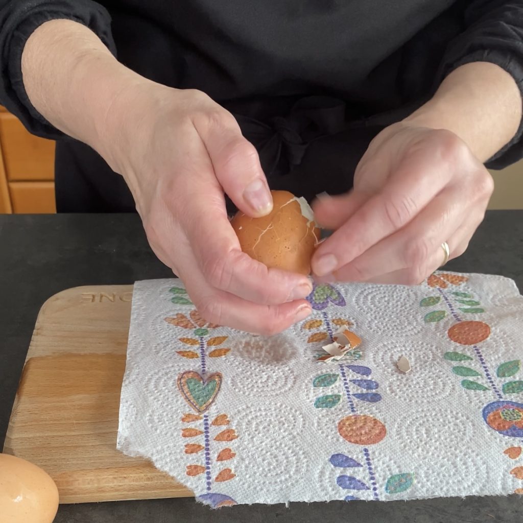 Rollen Sie die Eier auf einer Fläche und schälen Sie sie.