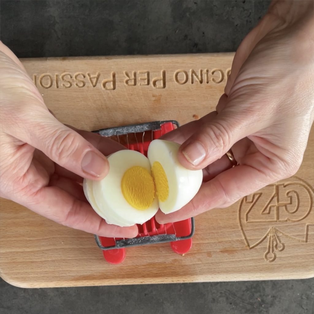 Legen Sie die Eier in einen Topf, bedecken Sie sie mit Wasser und kochen Sie sie 7 Minuten. Dann sofort unter kaltem, fließendem Wasser abschrecken, damit sie sich leicht schälen lassen.
