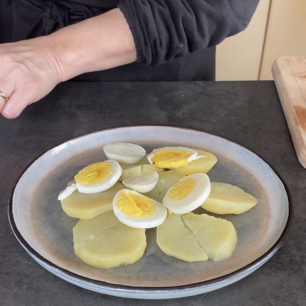 Wenn die Kartoffeln gekocht sind, schälen Sie sie und schneiden Sie sie in Scheiben.