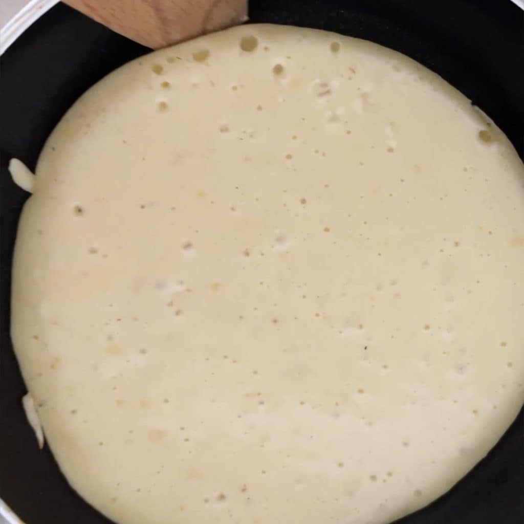 Die Pfanne auf den Herd stellen und erhitzen, alternativ können Sie die elektrische Crêpes-Platte oder eine größere Pfanne verwenden, um mehrere Pfannkuchen gleichzeitig zu backen. Wenn die Pfanne heiß ist, mit einer Kelle den Teig hineingeben, ohne ihn zu glätten, er wird sich von selbst ausbreiten.