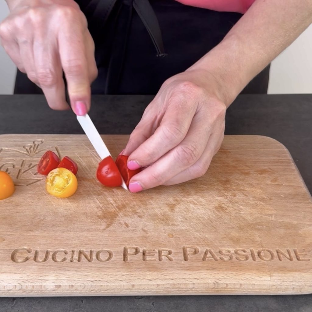 Wir beginnen mit der Zubereitung des Herzhaften Kuchens mit Kirschtomaten und Scamorza, waschen Sie die Kirschtomaten und halbieren Sie sie,