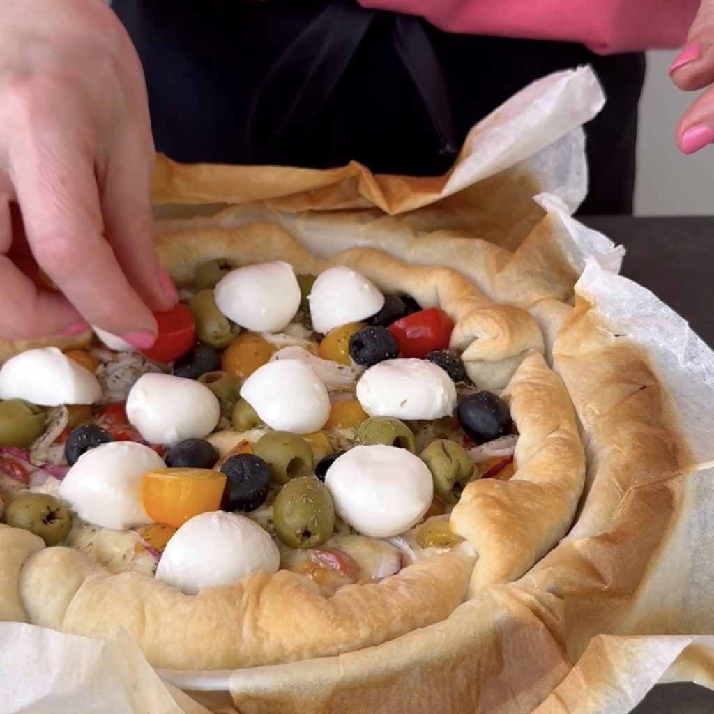 und einige Basilikumblätter hinzufügen. Servieren Sie den Herzhaften Kuchen mit Kirschtomaten und Scamorza warm oder auf Zimmertemperatur.