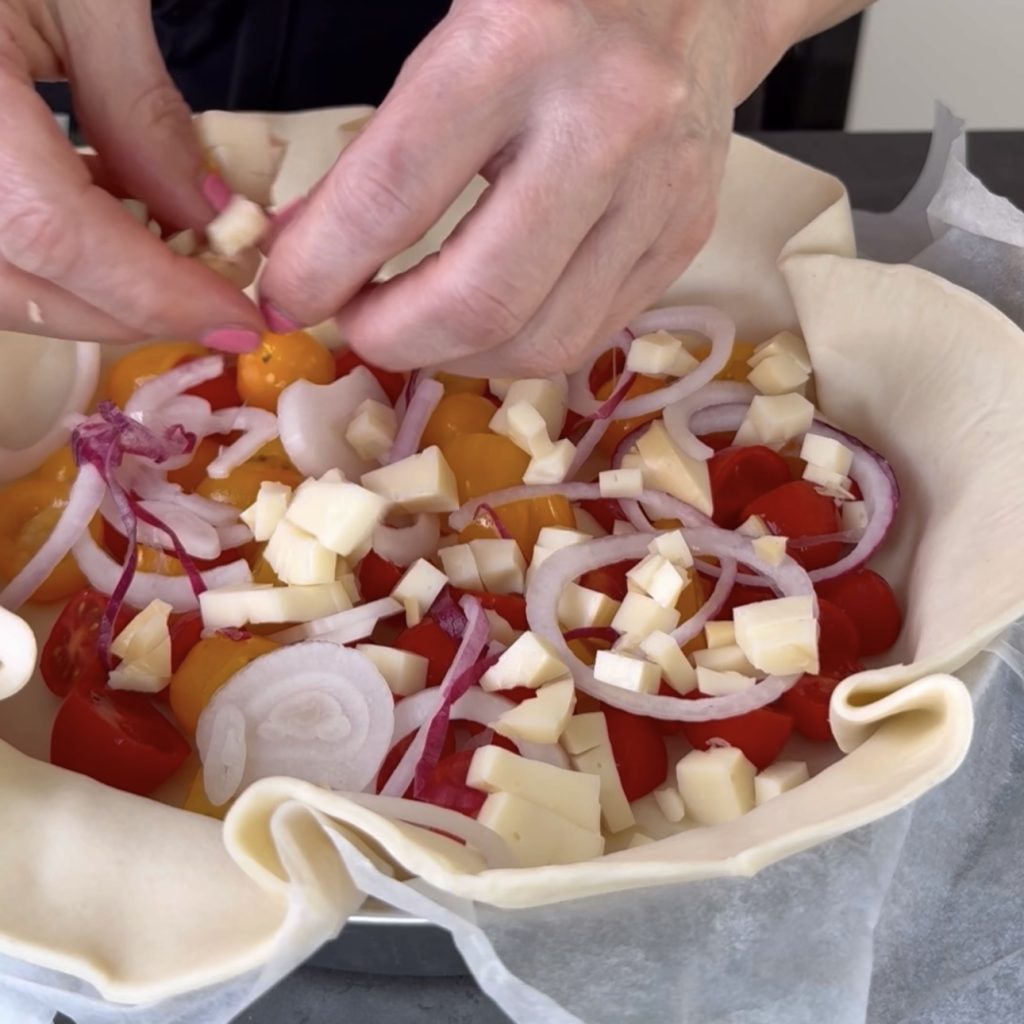 Wie man den herzhaften Kuchen mit Kirschtomaten und Scamorza macht