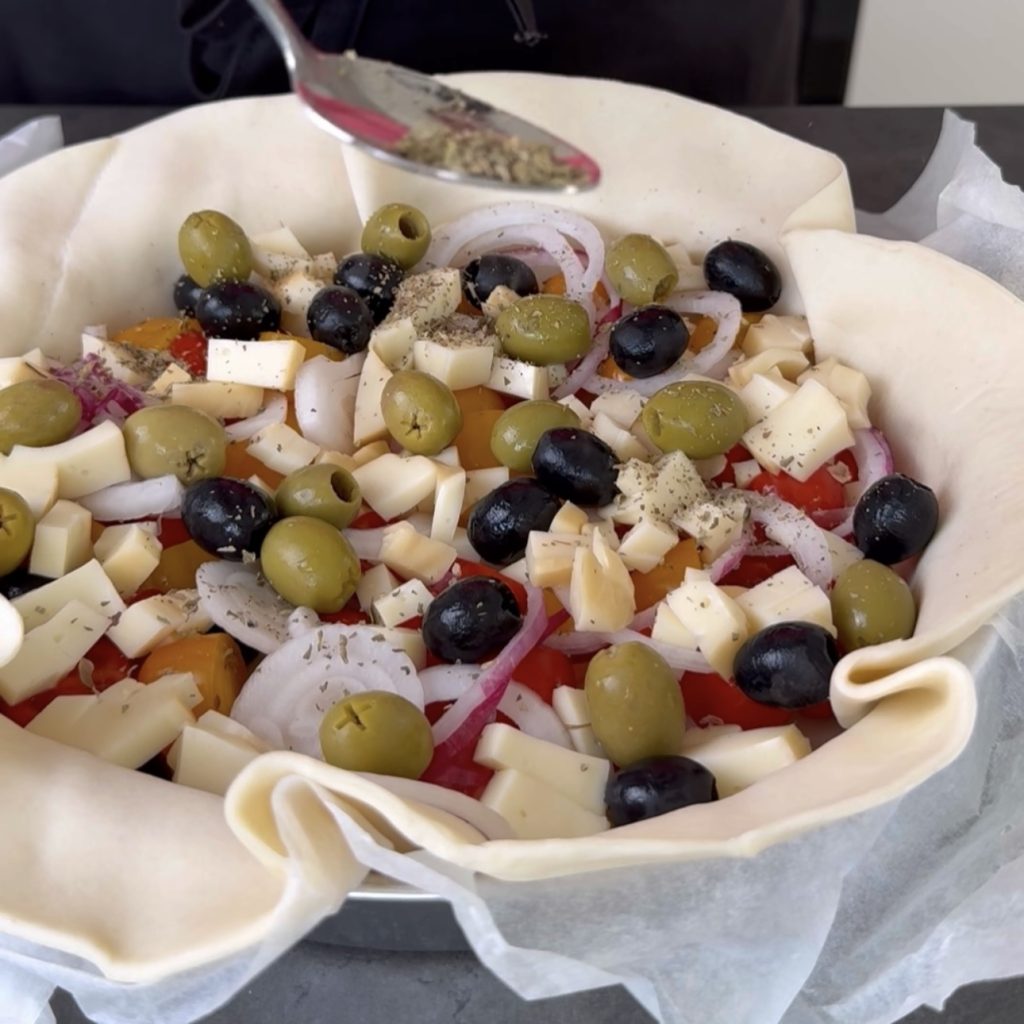 Rollen Sie die Ränder des Blätterteigs ein, um eine Kruste zu formen, und backen Sie sie im bereits vorgeheizten statischen Ofen 30 Minuten lang.