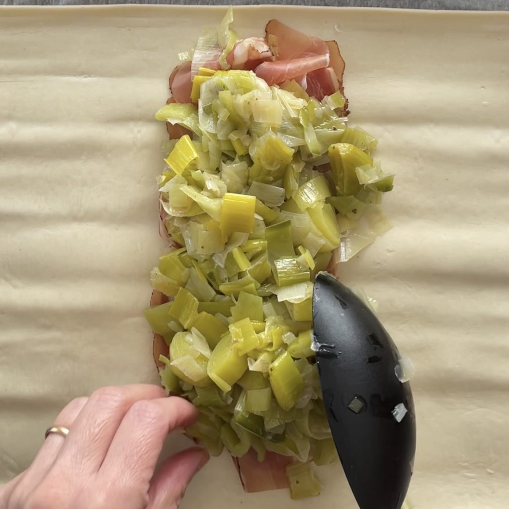 rollen Sie den Blätterteig aus, legen Sie die längere Seite zu Ihnen, legen Sie in die Mitte einen Teil des Specks und bewahren Sie 6/7 Scheiben auf, die dann zum Abdecken der Füllung benötigt werden.