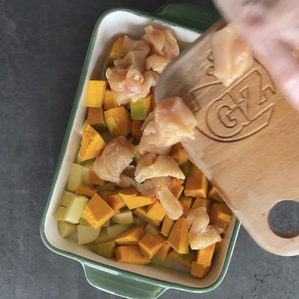 • hinzu und mischen Sie gut, um sowohl die Hühnerbrust als auch die Kartoffeln und den Kürbis gut zu würzen.