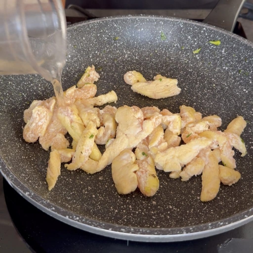 würzen Sie mit Salz, fügen Sie einen Spritzer Wasser hinzu, um die Hühnerbrust noch cremiger zu machen.