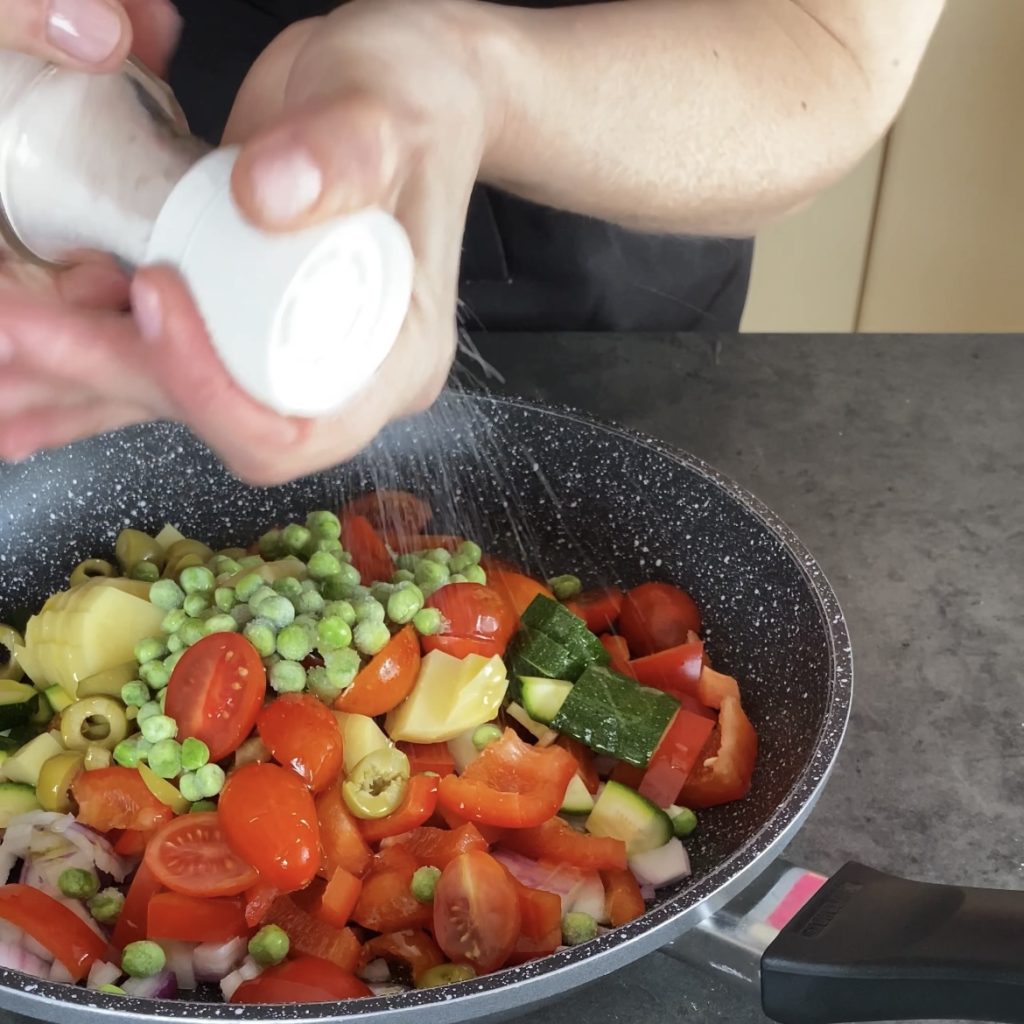 Alle frisch geschnittenen Gemüse in eine große Pfanne geben, auch frische oder gefrorene Erbsen hinzufügen