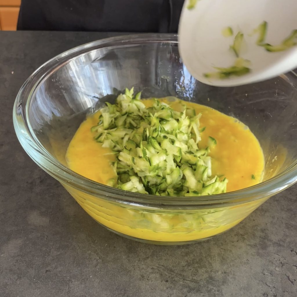 • Fügen Sie dann die geriebenen und gut ausgepressten Zucchini hinzu,