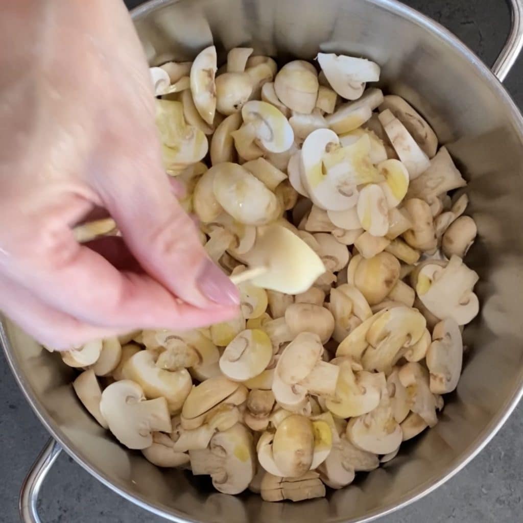 • Die Pilze 15 Minuten lang kochen, dabei gelegentlich umrühren. Wenn sie gar sind, mit Salz würzen und die Knoblauchzehe entfernen.