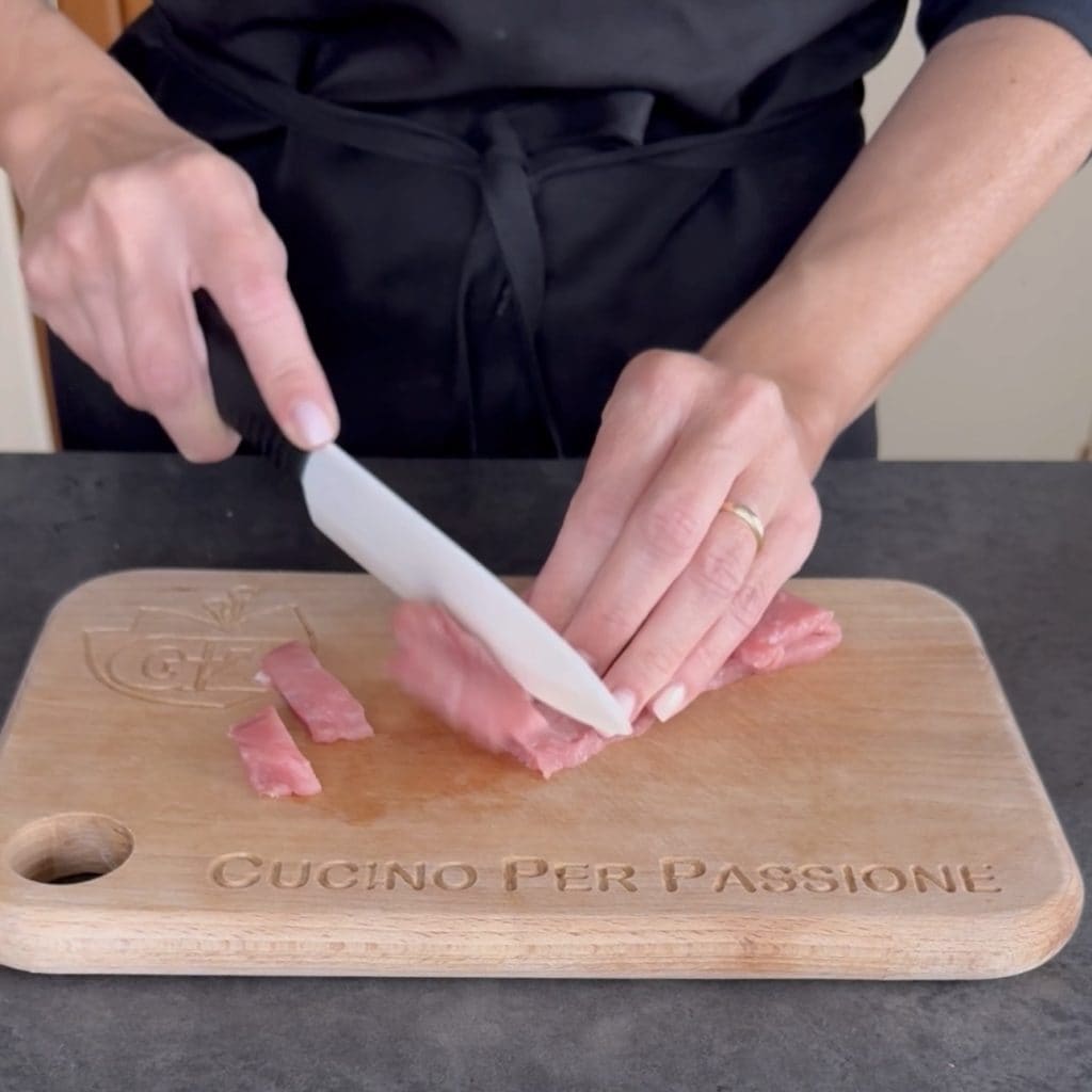 • Während die Pilze kochen, die Kalbsscheiben in Streifen schneiden,